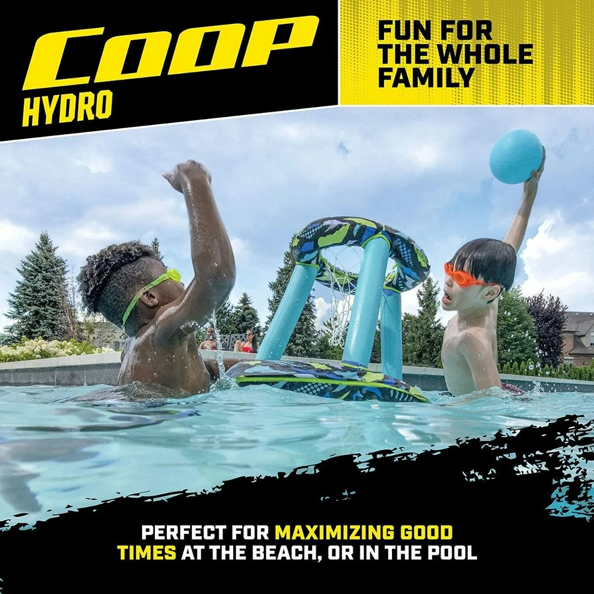 The Coop Hydro Spring Hoops is a floating basketball game set for the swimming pool! The floating net opens for instant action and easily closes for storage thanks to an inner spring in the base of the basket. The fabric covering on the goal features a brightly colored surfer-inspired pattern that kids and teens love. This fabric cover also adds durability to the inflation chambers. Each basketball set includes an inflatable basketball with a textured grip for non-slip performance. Great for pool parties, endless summer days, and vacations. Folds flat and compact into three circles β itβs the perfect swimming pool game for travel! Includes one floating net and one ball per set. Carry/storage bag included. Colors and styles may vary. Sold individually. For children age 5 and older. Please note, colors/designs may vary.