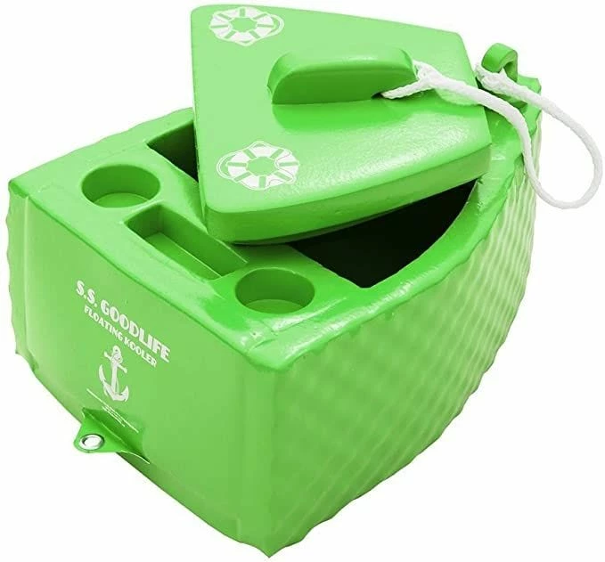 The SS Goodlife Kooler is equipped with a tie-off grommet to keep your beverages close while you float it behind your kayak, fish off the dock or enjoy the nearest beach. The vinyl coating resists the effects of chlorine, salt water and the sun and is easy to clean and disinfect. The lift-off lid is attached with a rope so you will not lose it. The top of the SS Goodlife Kooler has beverage and/or accessory holders for your convenience. This charming kooler will hold ice over 12 to 18 beverages, keeping them cold for hours while floating in your hot tub or pool.